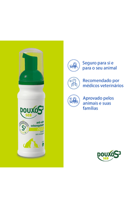 DOUXO S3 Seb mousse, coadjuvante de ações de tratamento e profilaxia de todos os tipos de seborreia em cães e gatos.
