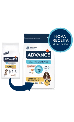 Advance Adult Sensitive Care Medium/Maxi é especialmente indicado para ajudar na digestão dos cães.