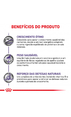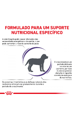 Royal Canin Neutered Junior é indicado para cachorros esterilizados, de raças médias (peso em adulto de 11 a 25kg), com tendência para o excesso de peso ou com sensibilidade cutânea, da esterilização aos 12 meses de idade.