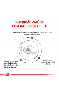 Combinação de proteínas de elevada digestibilidade (L.I.P.), prebióticos (fruto-oligossacarídeos e mano-oligossacarídeos), polpa de beterraba, arroz e óleo peixe para assegurar a máxima segurança digestiva.